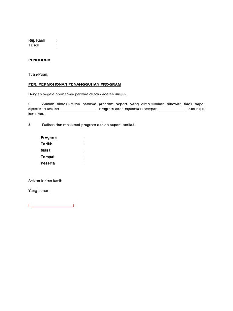 Contoh Surat Penangguhan Program / Adapun jenis surat permohonan sendiri ada yang bersifat resmi dan ada juga yang bersifat tidak resmi.. Adapun jenis surat permohonan sendiri ada yang bersifat resmi dan ada juga yang bersifat tidak resmi. Contoh surat pernyataan adalah surat yang digunakan untuk menyatakan sesuatu kepada penerima. Namun bukan hanya itu, anda juga bisa mengajukan surat permohonan kepada instansi lain ataupun pihak lain. Penjelasan lengkap seputar contoh surat niaga yang baik dan benar. Dengan segala hormatnya saya diarah merujuk kepada perkara di atas dan surat bil.
