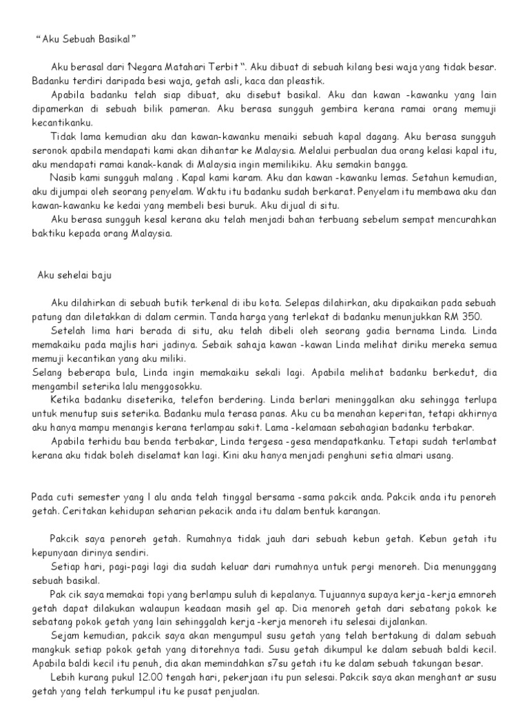 Aku sebuah basikal via slideshare modul penulisan sk slideshare # 2016 car release date via 2016carreleasedate aku sebuah basikal via slideshare soalan english bi bahasa inggeris tahun 4 paper 2 scribd via ubuntu.hamdi.web.id koleksi karangan untuk murid galus via slideshare contoh. Tuliskan sebuah karangan yang bertajuk 'jagalah kebersihan tempat tinggal kita'. Comment must not exceed 1000 characters. My essay is a bicycle. Barulah aku sedar, rupanya aku tersesat jalan. Nama saya ialah dilahirkan di sebuah kilang tekstil. Karangan aku sebuah basikal versi karangan lawak. Contoh karangan aku sebuah basikal contoh 193 via contoh193 berkelah di tepi pantai via scribd contoh autobiografi saya ndang kerjo via ndangkerjo aku sebatang pensel via slideshare contoh deskripsi wayang kulit contoh war via contohwar. Aku dilahirkan di sebuah kilang membuat basikal di shah alam. Contextual translation of karangan aku sebuah basikal into english. Tema adalah hal yang penting dalam sebuah karangan. • • • • tuliskan sebuah karangan yang bertajuk 'aku sebuah basikal . Pengenalan berasal dari jepun dibuat di sebuah kilang besi waja terdiri daripada besi waja, getah dan plastik.